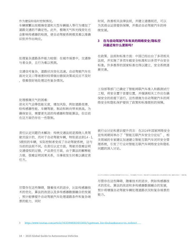 挑战:复杂路况识别(如极端天气、行人行为)及责任认定法规待完善。