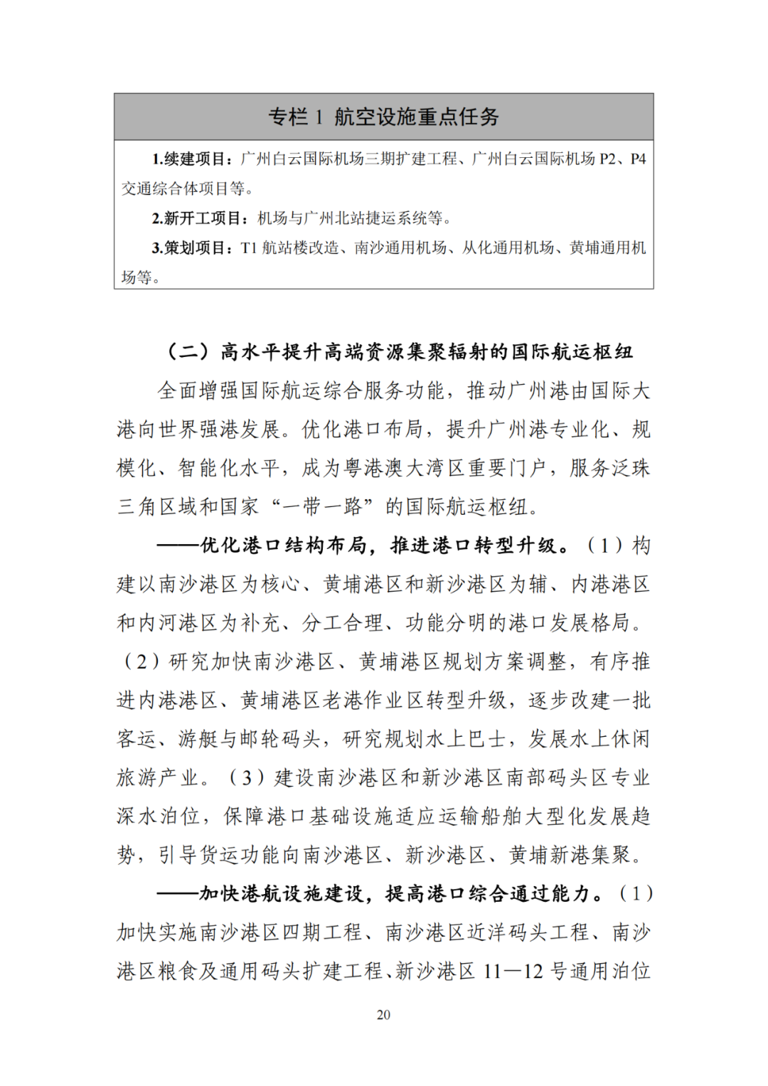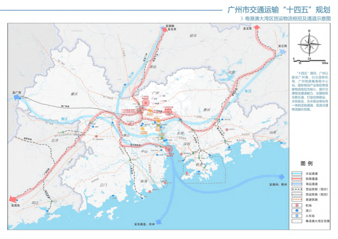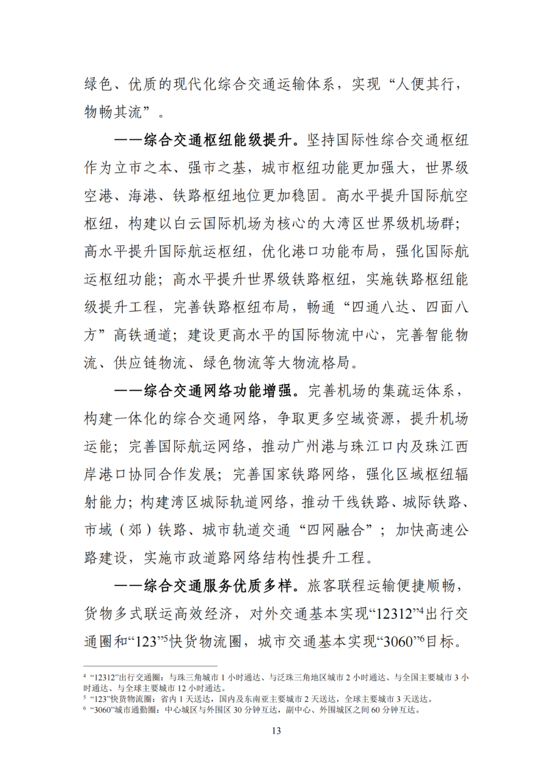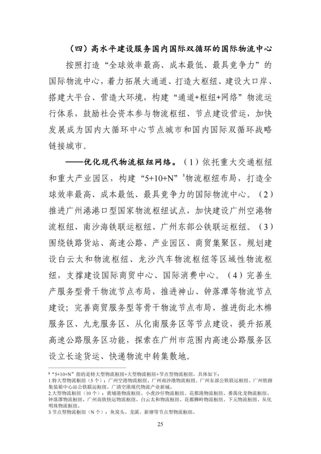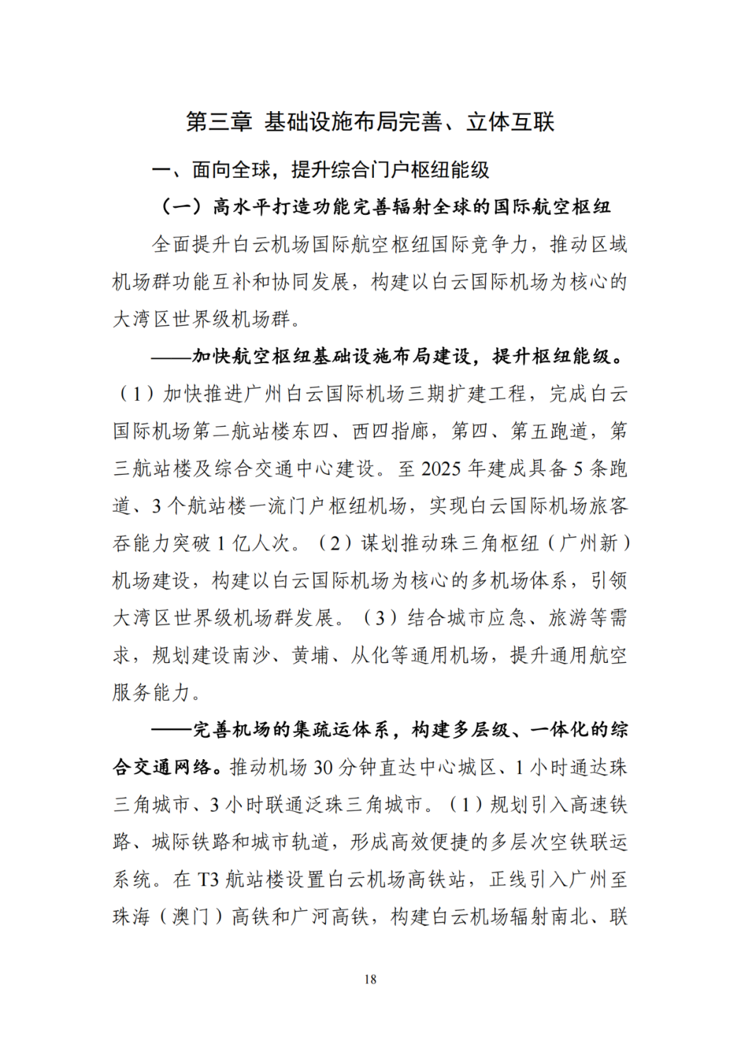 提升全球门户枢纽能级,打造国际航空枢纽(白云机场三期扩建、珠三角枢纽机场谋划)、国际航运枢纽(南沙港区升级)、世界级铁路枢纽(10 条出省通道)、国际物流中心(“5+10+N” 物流枢纽布局)。