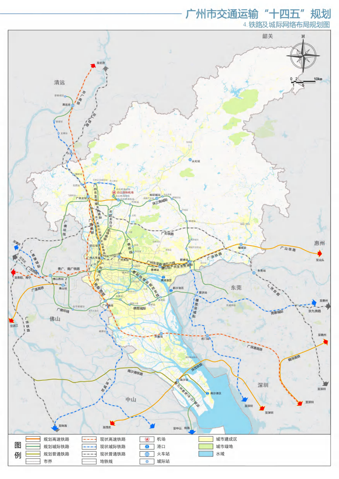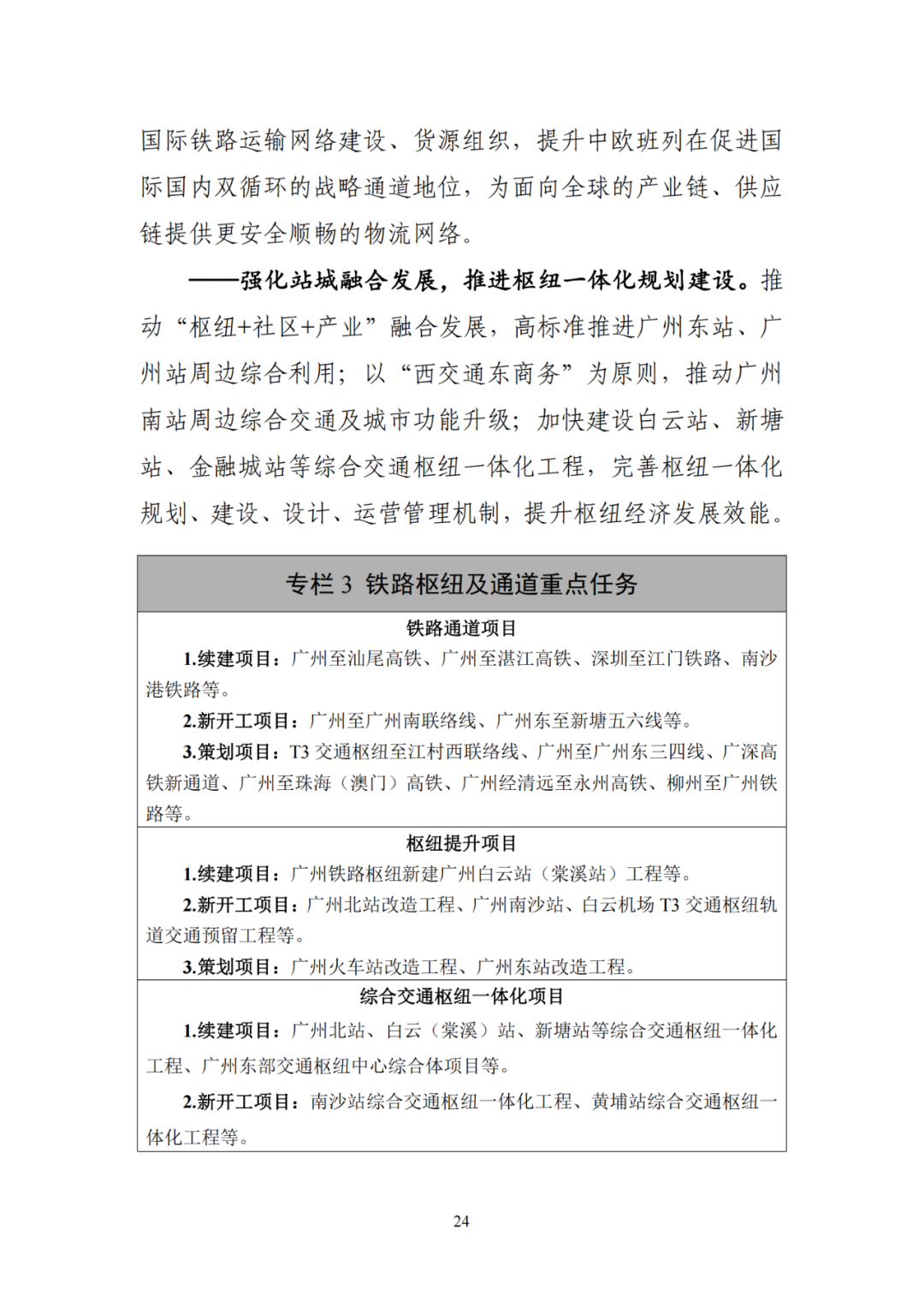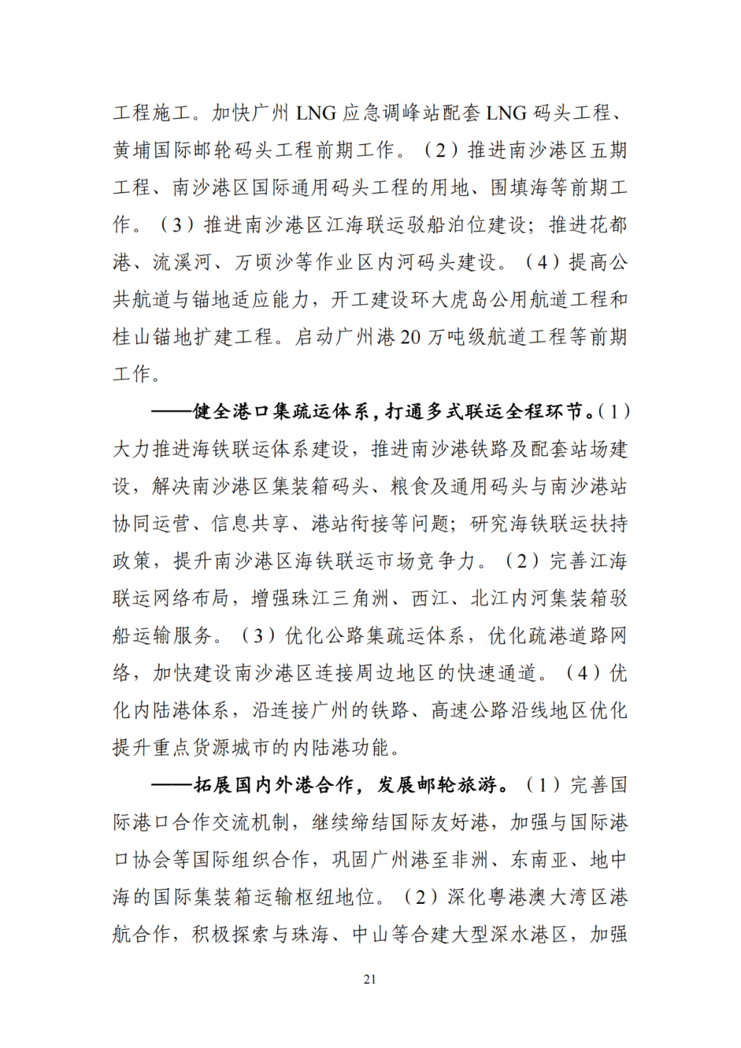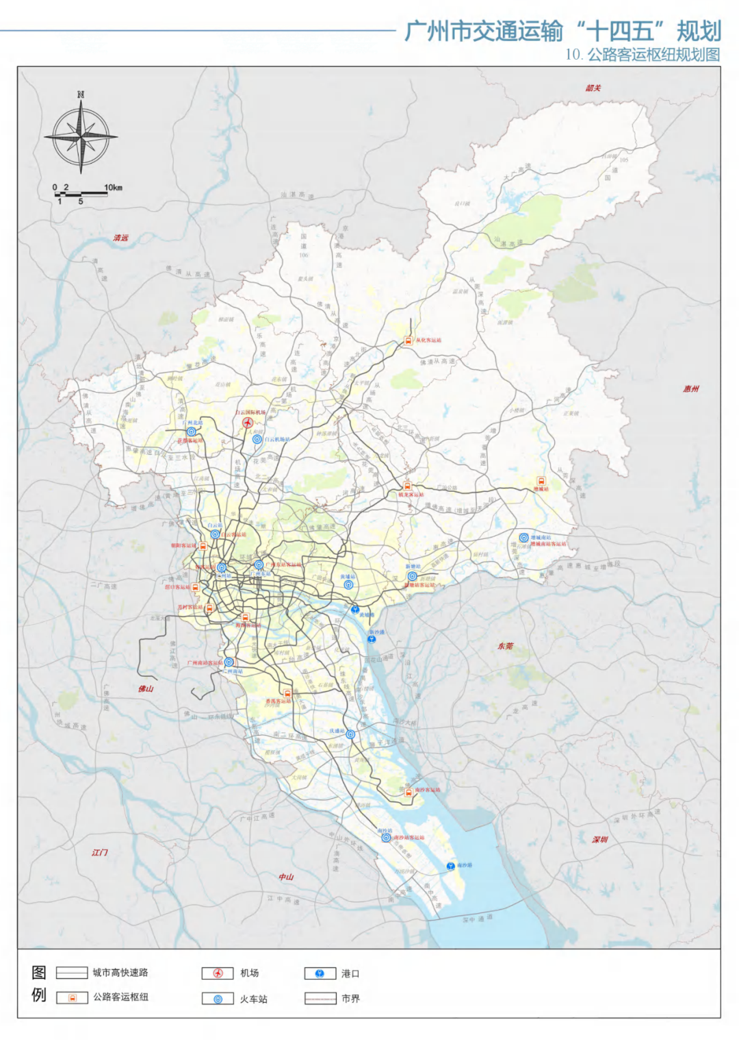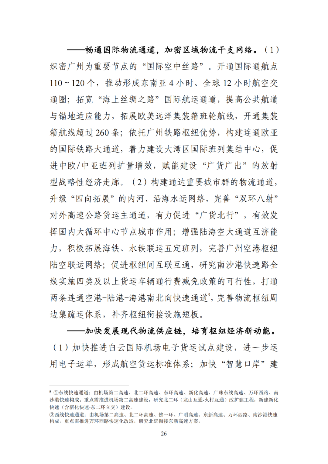 提升全球门户枢纽能级,打造国际航空枢纽(白云机场三期扩建、珠三角枢纽机场谋划)、国际航运枢纽(南沙港区升级)、世界级铁路枢纽(10 条出省通道)、国际物流中心(“5+10+N” 物流枢纽布局)。