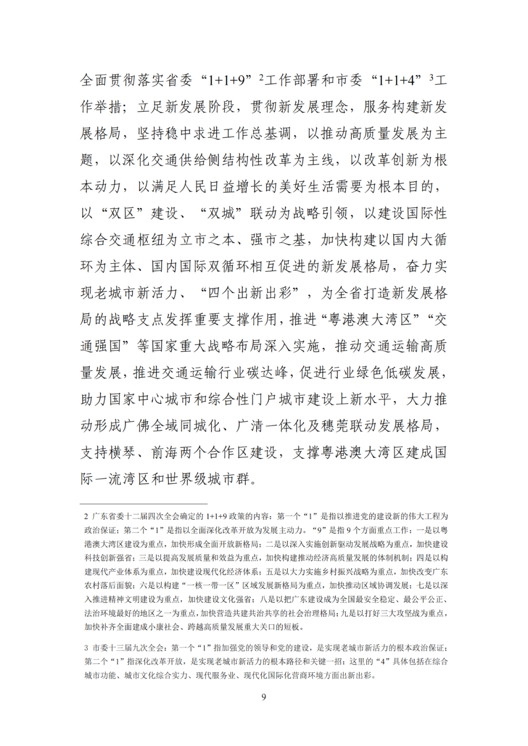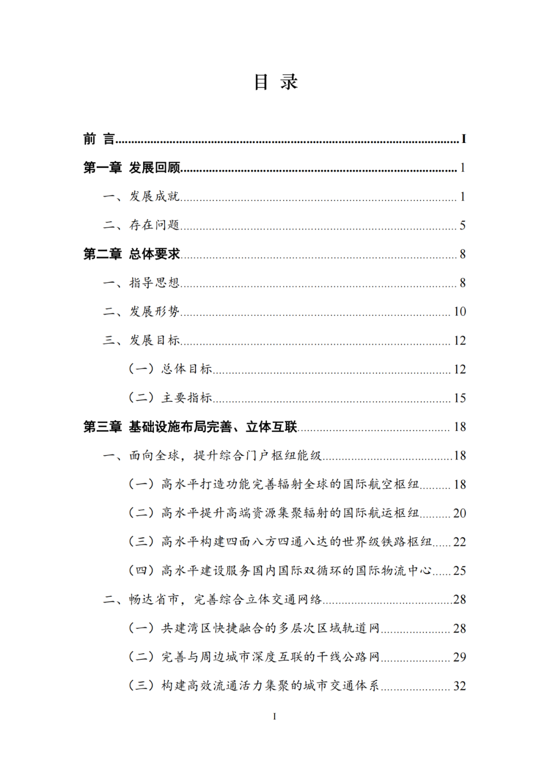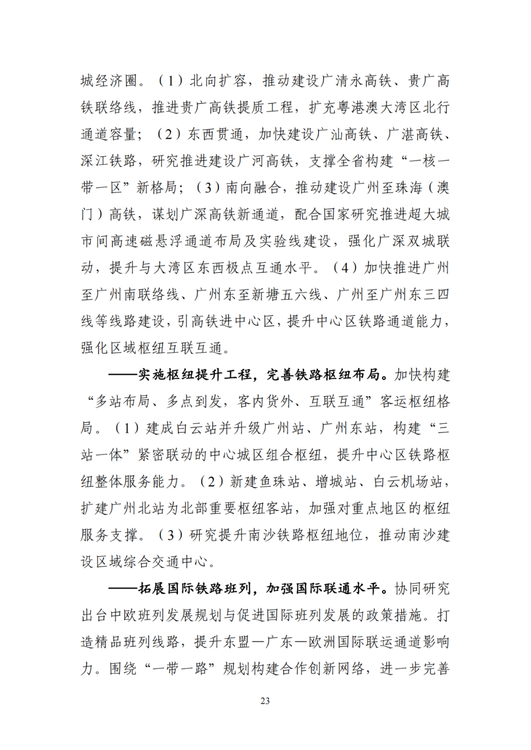 完善区域交通网络,共建湾区多层次轨道网,加密干线公路和珠江口过江通道,构建高效城市交通体系,补齐公交场站、慢行和停车设施短板。
