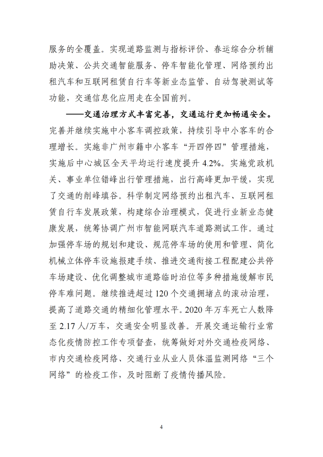 发展智慧交通新基建,建设智慧枢纽、智能网联汽车试点,构建综合交通出行服务平台,升级 “广州交通・行讯通” 等服务。