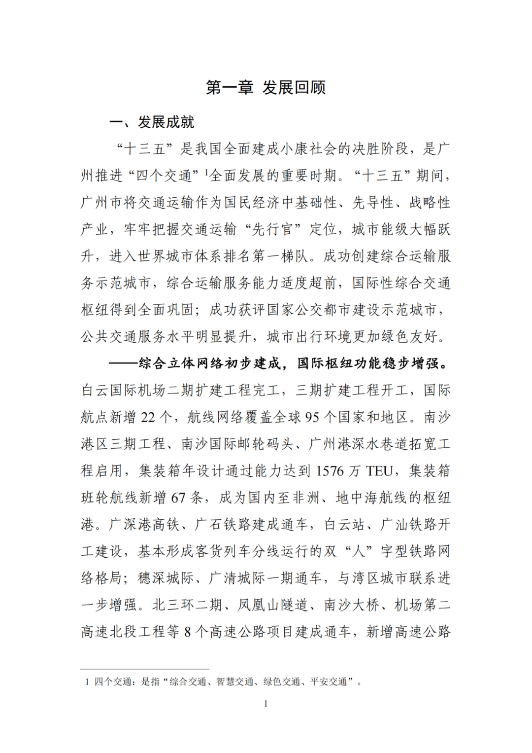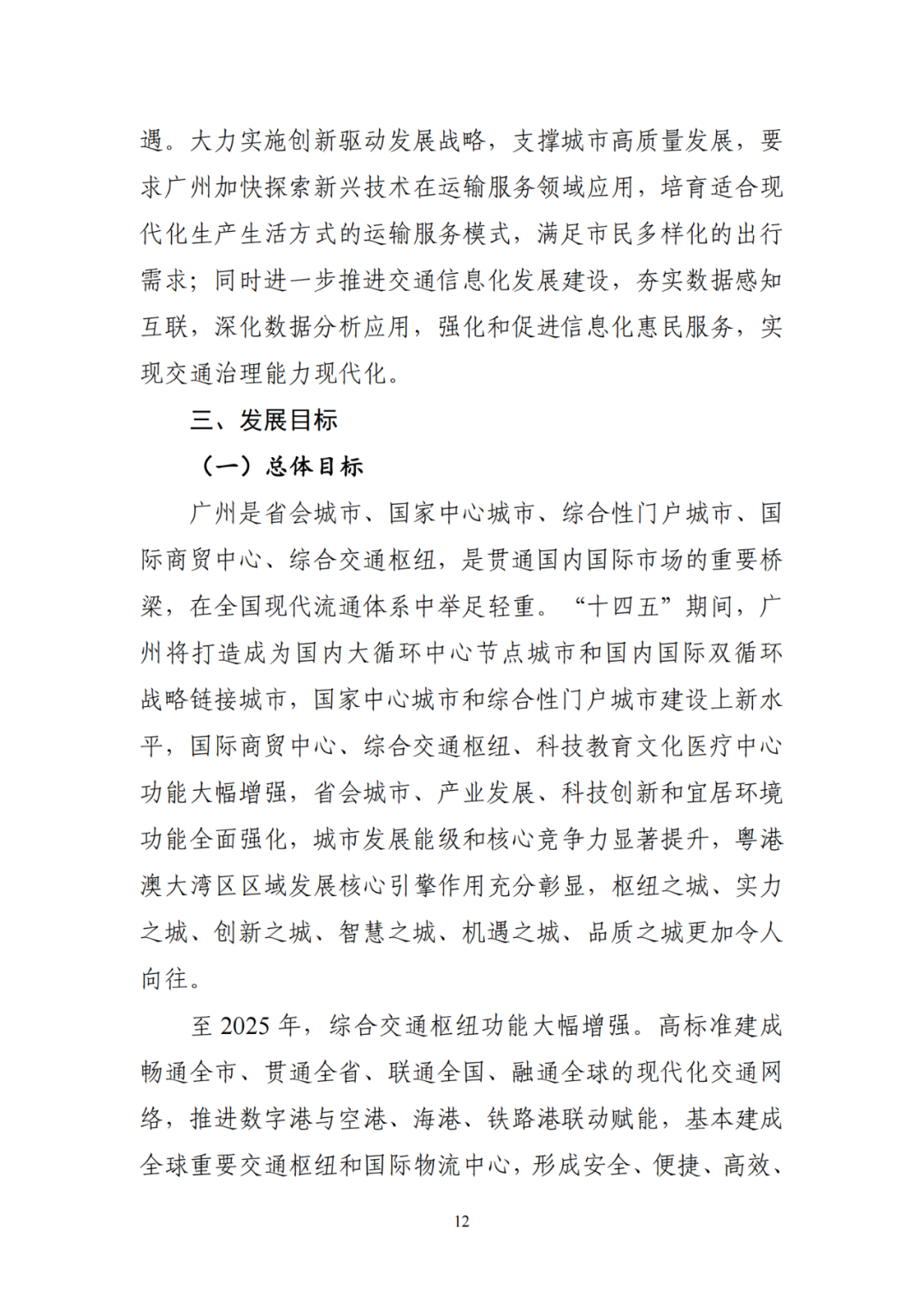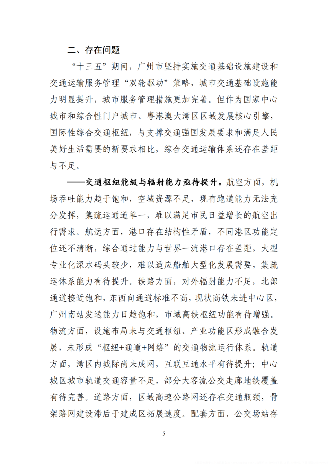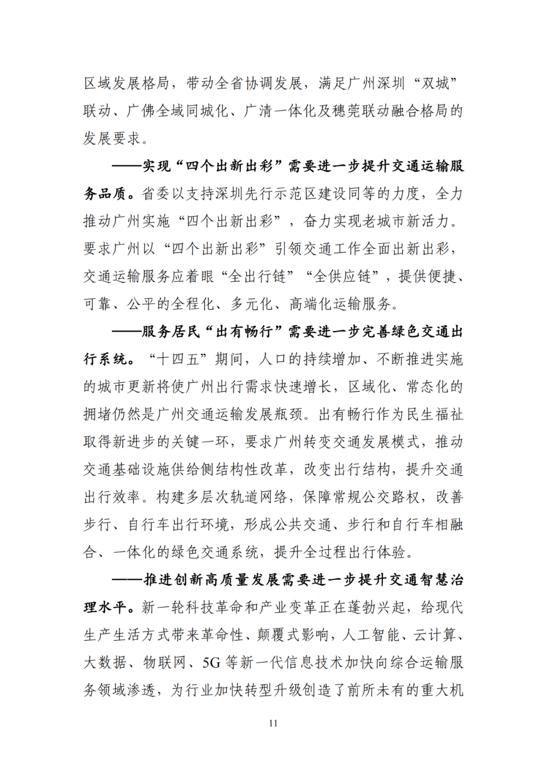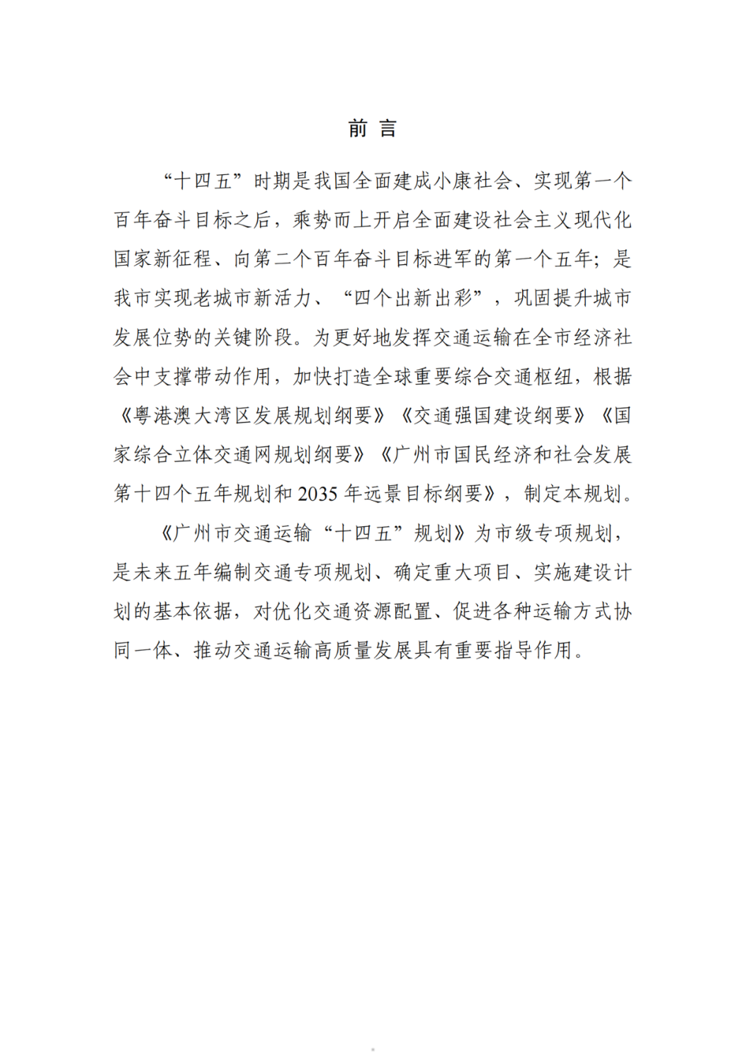 《广州市交通运输 “十四五” 规划》是市级专项规划,立足新发展阶段,以打造全球重要综合交通枢纽和国际物流中心为核心,构建安全、便捷、高效、绿色、优质的现代化综合交通运输体系,支撑广州实现老城市新活力、“四个出新出彩”,助力粤港澳大湾区建设。