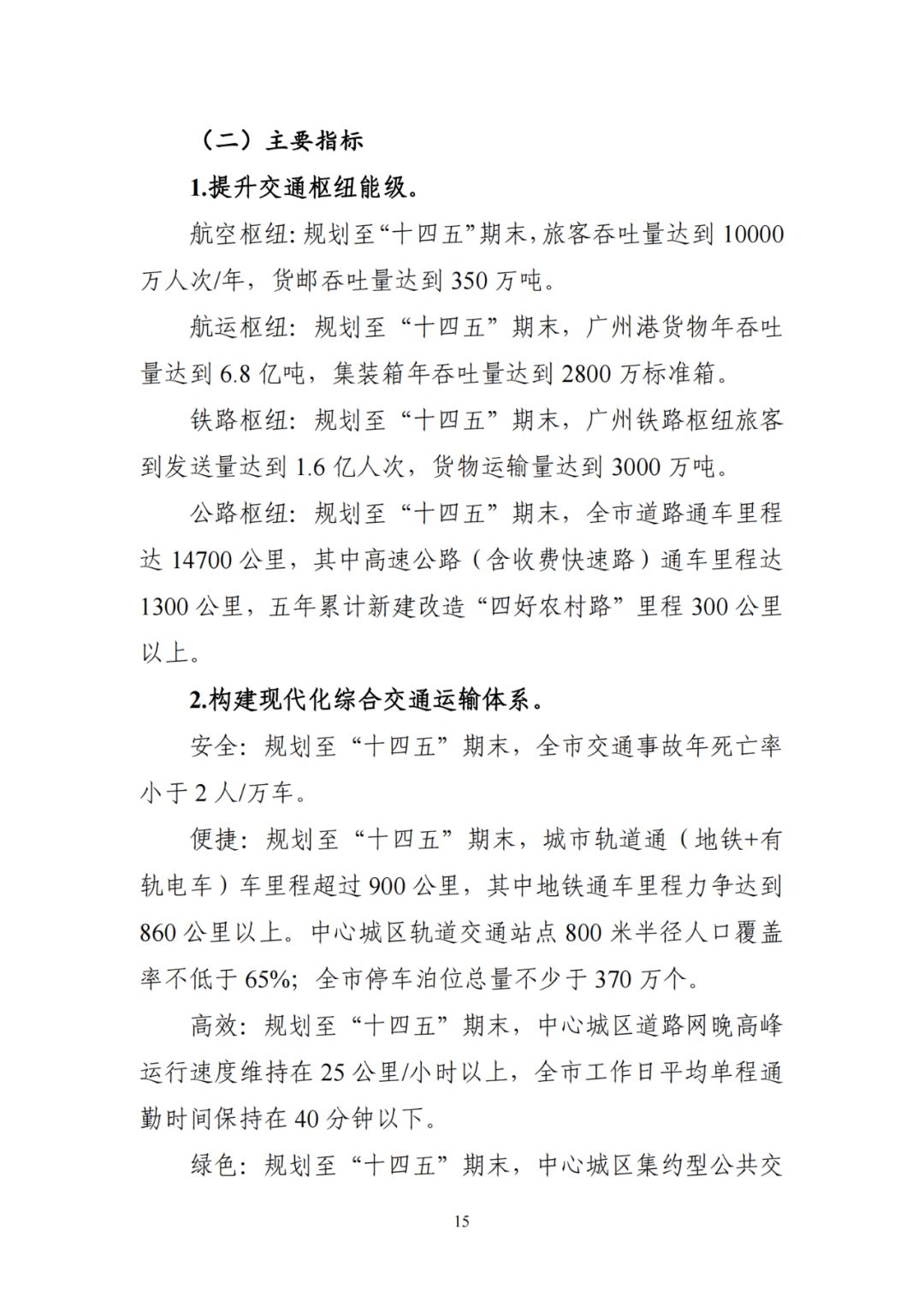 网络便捷:城市轨道交通通车里程超 900 公里,中心城区轨道交通 800 米半径人口覆盖率≥65%,停车泊位总量≥370 万个。