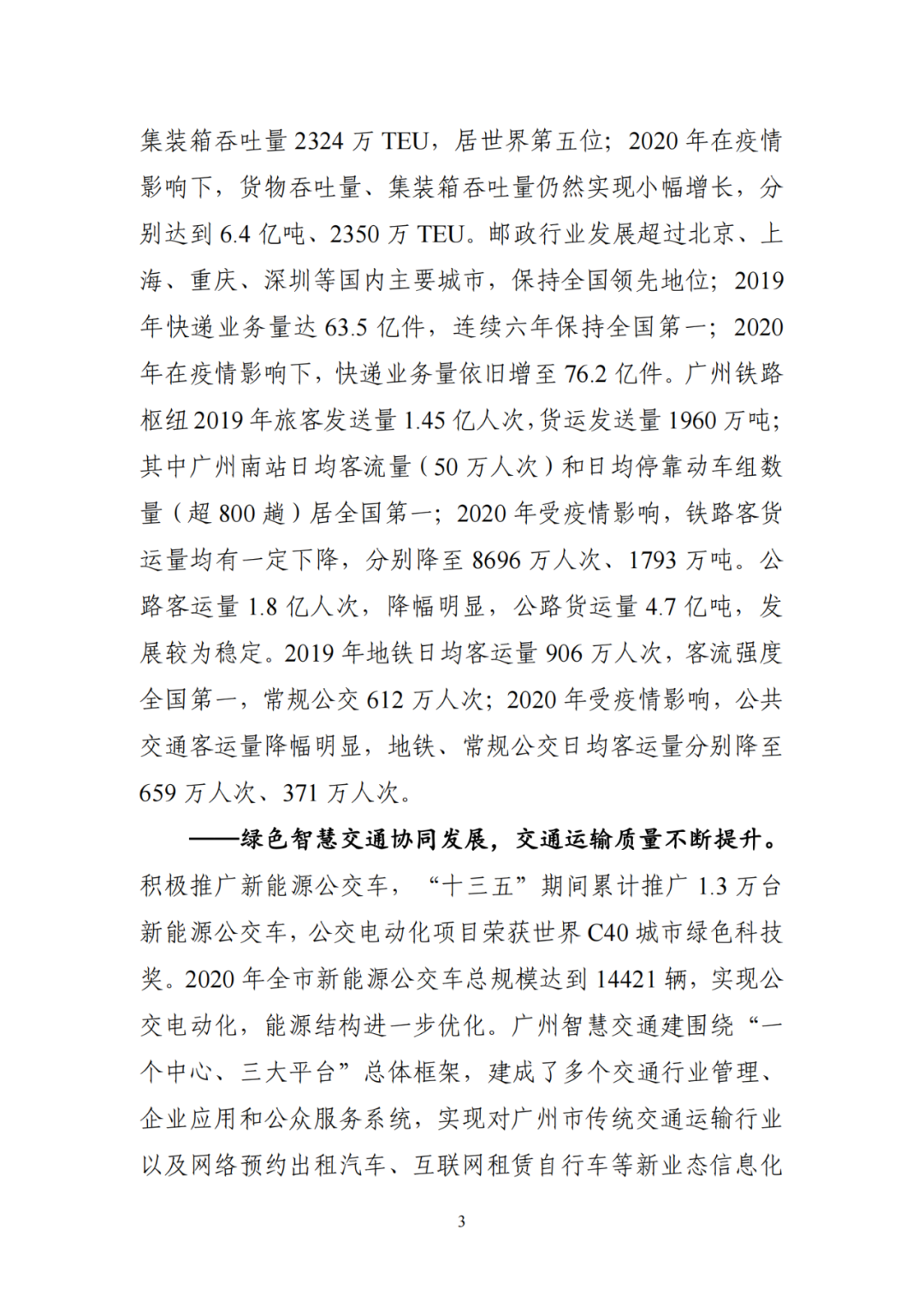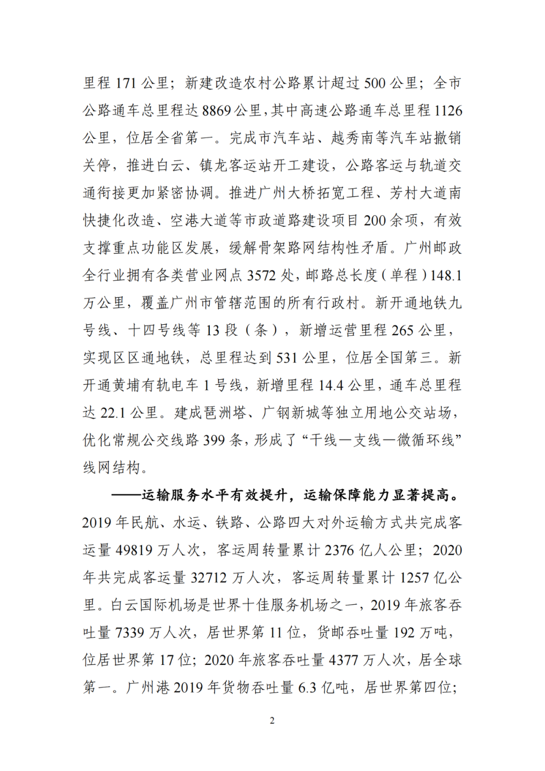 运输服务水平提升,白云机场 2020 年旅客吞吐量全球第一,广州港货物和集装箱吞吐量稳居世界前列,快递业务量连续多年全国第一。