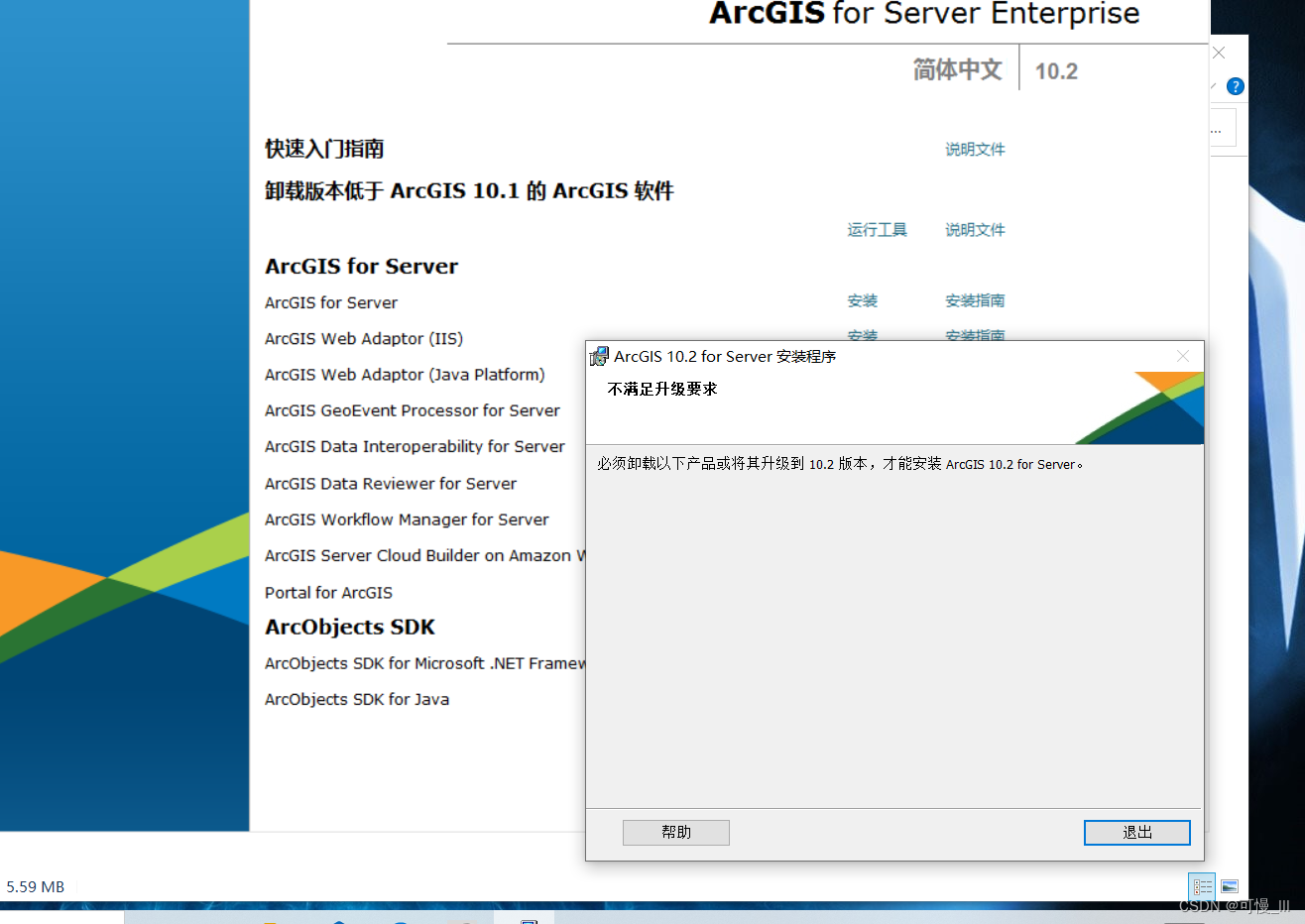 arcgis版本10.2.2(如图)。一直提示我不满足安装需求“必须卸载一下产品或将其升级到”版本,才能安装ArcGIS10.2 for sever(如图),但是并未告诉我是什么产品部满足需求。