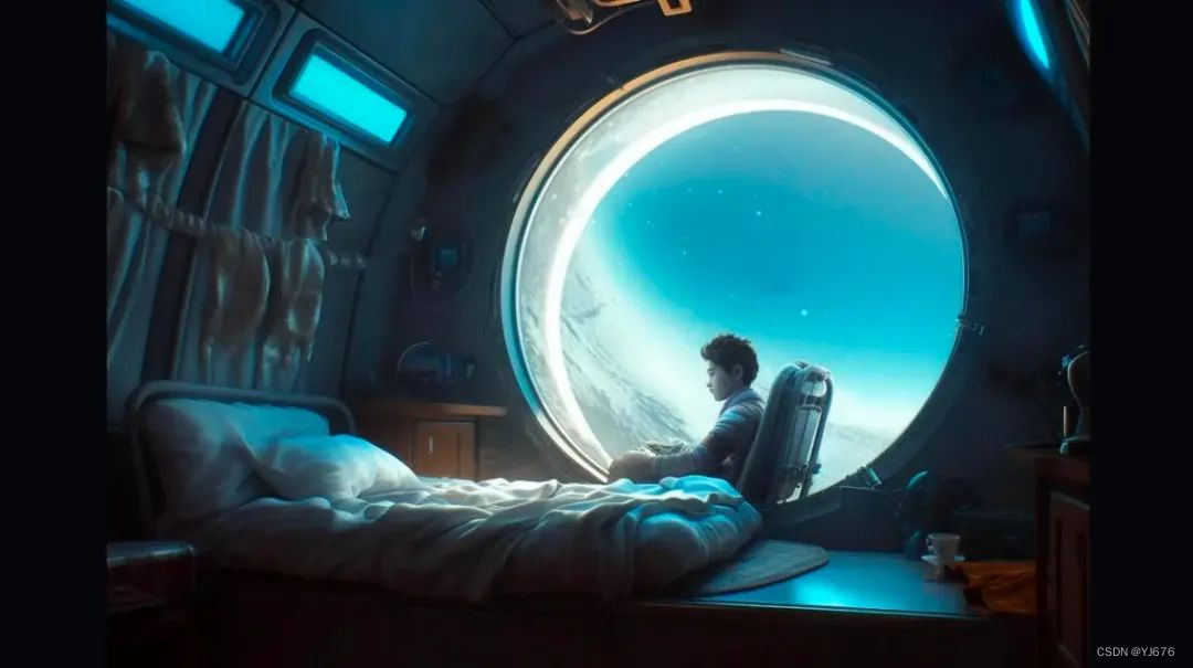 卧室床,胶囊圆窗,太空站,从太空看到的地球,窗外,内部形式,高细节,最佳质量,电影镜头,电影灯光,摄影 --ar16:9 --v5