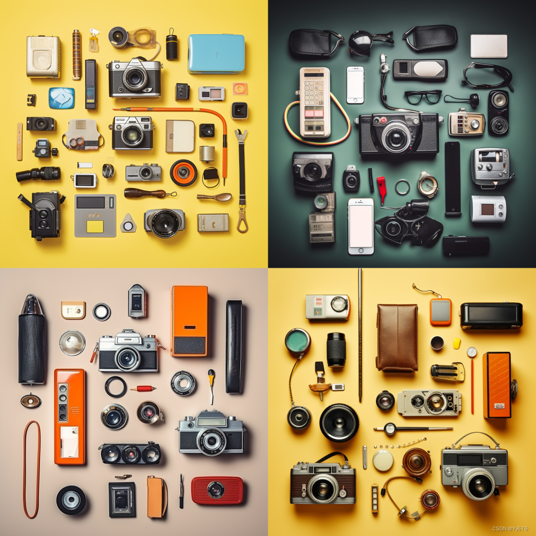 提示词:平铺罗列,复古,二手,收音机,手机,照相机,各种小物件,8k --ar 1:1