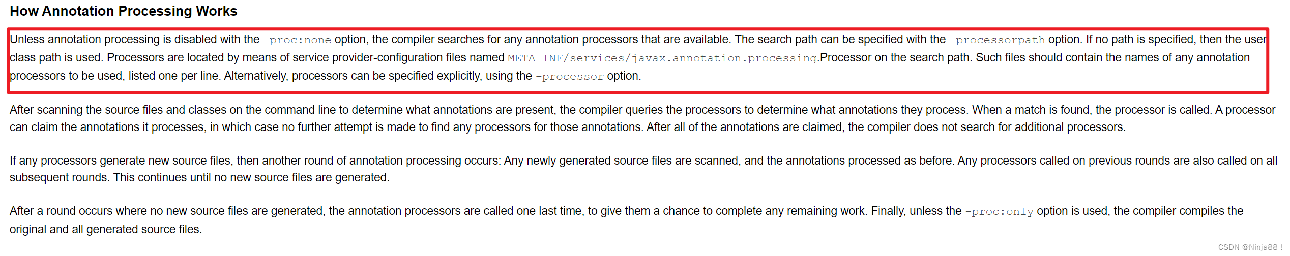 这样就显式声明了使用什么注解处理器去处理。但一般我们很少这么去做,比如Lombok,我们也并没有采用这种方式去使用Lombok,而是直接使用mvn compile。这是因为maven默认的编译器,本质上还是封装的javac命令,而默认用javac去编译源代码时,如果没有指定任何注解处理器,那么默认会去找META-INF/services/javax.annotation.processing.Processor 文件中声明的注解处理器。