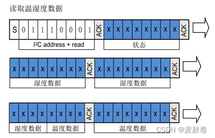 在启动传输后,随后传输的I2C首字节包括7位的I2C设备地址 0x38和一个SDA方向位 x (读R:‘1’,写W:‘0’)。在第8个SCL时钟下降沿之后,通过拉低 SDA引脚 (ACK位),指示传感器数据接收正常。在发出初始化命令之后 (‘1011’1110')代表初始化,‘1010’1100’ 代表温湿度测量), MCU必须等到测量完成。注意:图中标注设备地址:0x38,后面再加上一位读写位也就是 0111000 0/1(0x70 0x71)