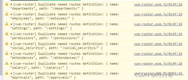 路由设置是通过router.addRoutes(filterRoutes)来添加的,退出时,并没有清空,再次登陆,又加了一次,所以有重复。