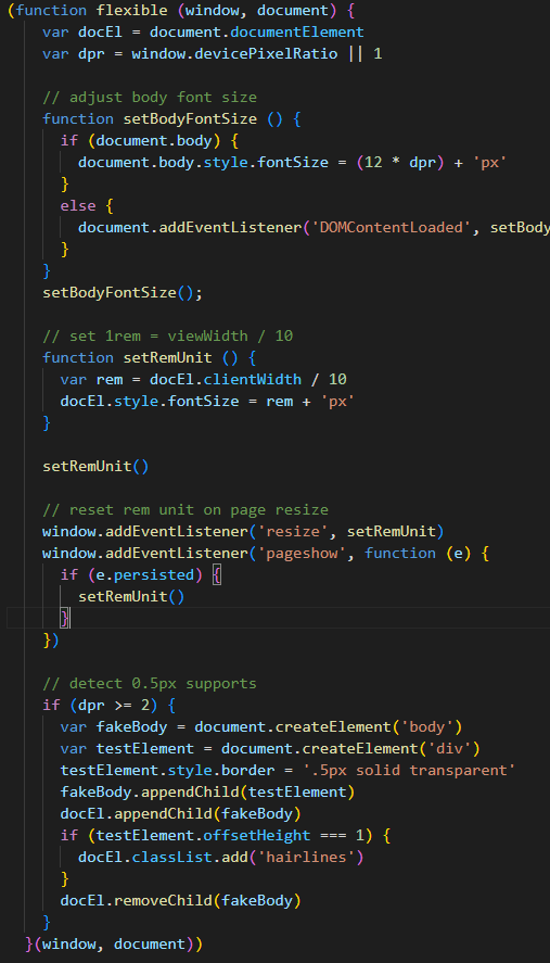 引用flexible 通过rem作移动端的适配(简单好用) (function flexible (window, document) { var docEl = document.documentElement var dpr = window.devicePixelRatio || 1 // adjust body font size function setBodyFontSize () { if (document.body) { document.body.style.fontSize = (12 * dpr