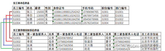 01--MySQL数据库概述 它们之间借助第三张“选课信息表”实现关联关系,而“学生信息表”与“选课信息表”是一对多关系,“课程信息表”与“选课信息表”也是一对多关系。“员工基本信息表”中存储的是频繁使用的信息,“员工紧急情况联系信息表”中存储的是不常用的信息,这两个表中的一条记录都代表一个员工的信息。“部门表”中的一条记录,在“员工基本信息表”中可以找到一条或多条记录对应,但反过来“员工基本信息表”中的一条记录在“部门表”中只能找到一条记录对应,即一个部门可以有多个员工,但是一个员工只能属于一个部门。