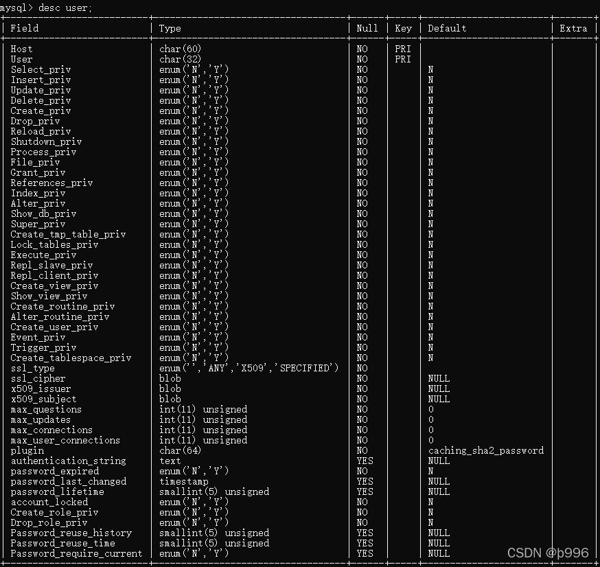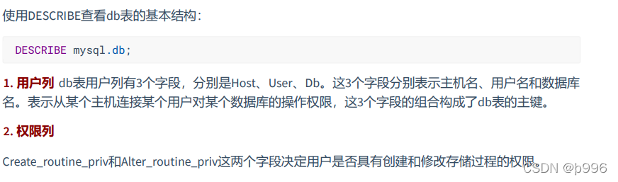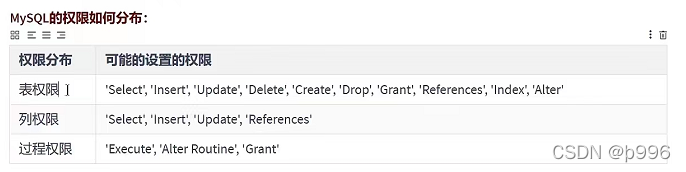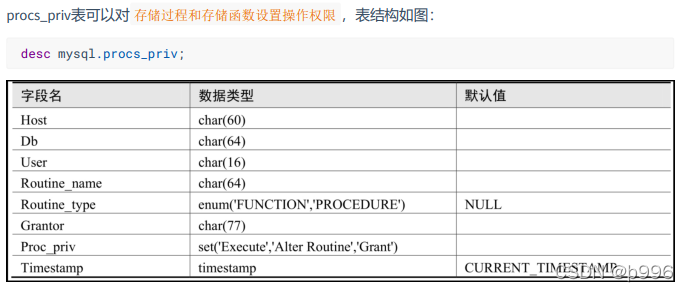 - Proc_priv表示拥有的权限,包括Execute、Alter Routine、Grant三种(表结构中有显示出来)