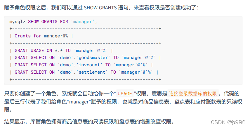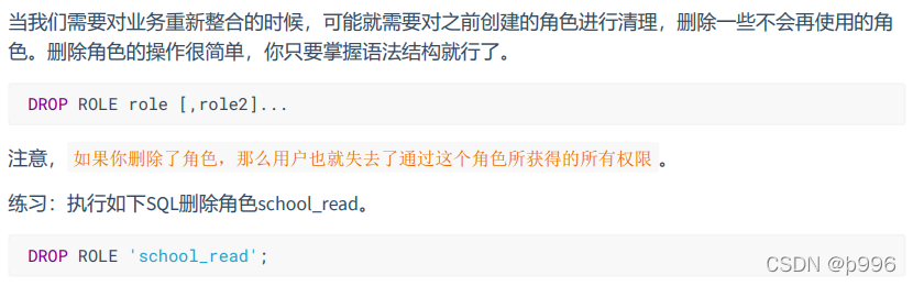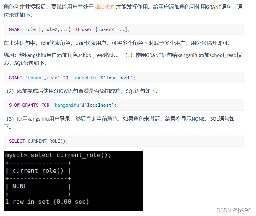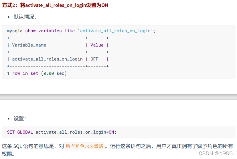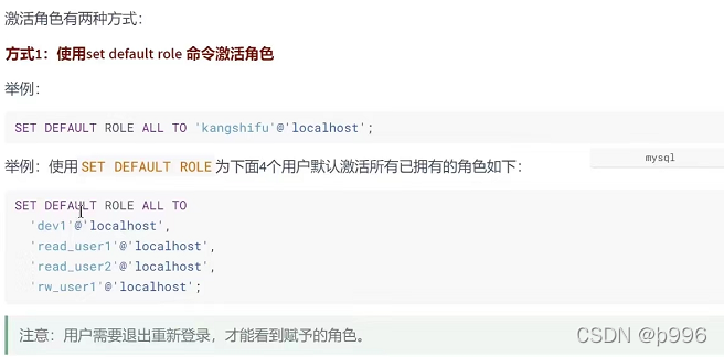 或者你用赋予了角色的用户去登录、操作,你会发现,这个账号没有任何权限。这是因为MySQL中创建了角色之后,默认都是没有被激活,也就是不能用,必须要手动激活,激活以后用户才能拥有角色对应的权限。