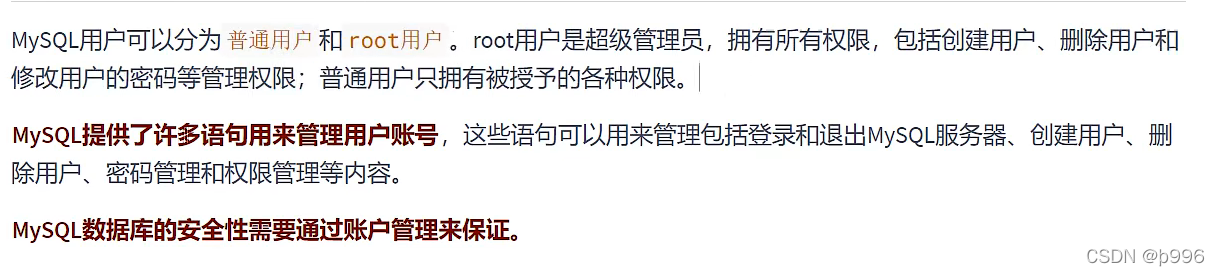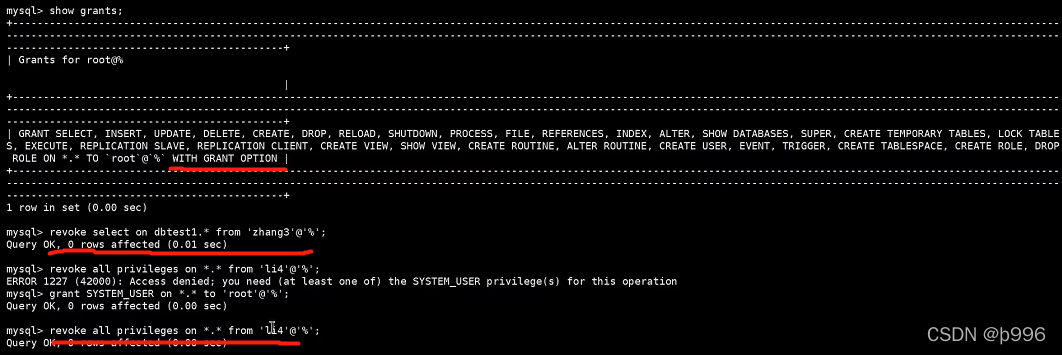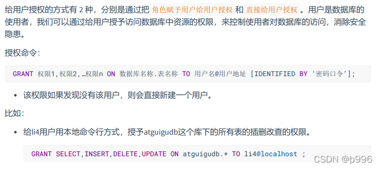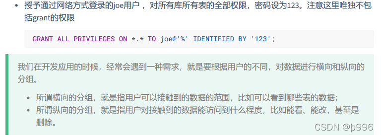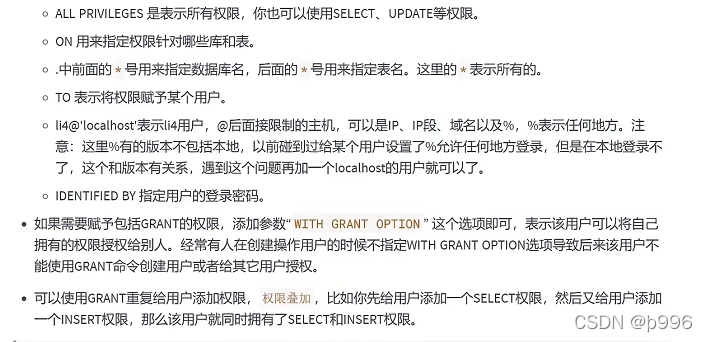 root用户将授予所有权限给某一个用户,这个用户和root用户的区别在于,root用户能够赋予别人权限,但用户不行,除非再加上"WITH GRANT OPTION" 。