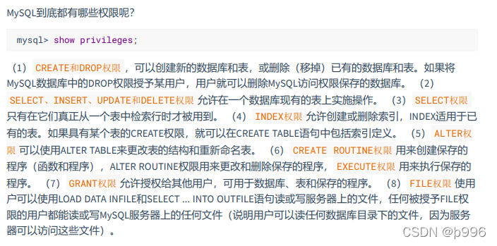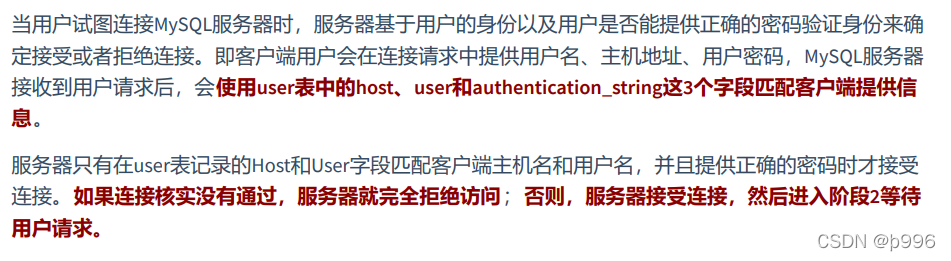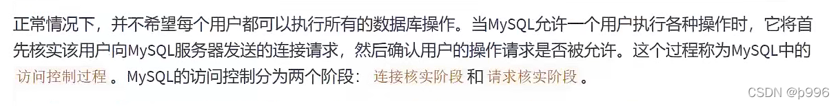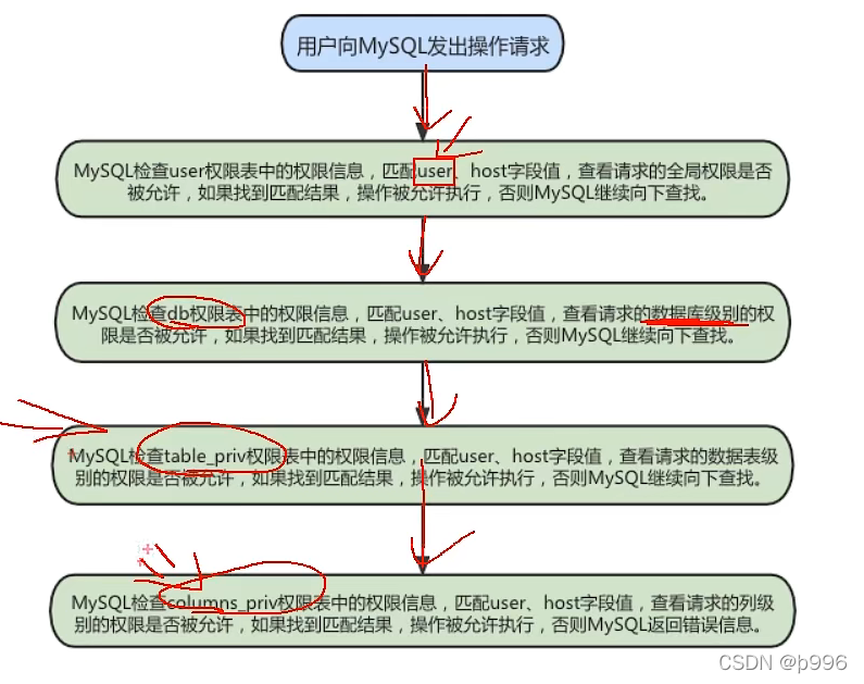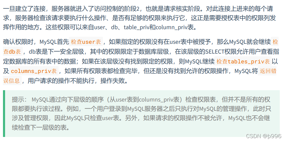 MySQL服务器通过权限表来控制用户对数据库的访问,权限表存放在mysql数据库(这里的mysql是数据库中的名字为mysql的数据库)中。MySQL数据库系统会根据这些权限表的内容为每个用户赋予相应的权限。这些权限表中最重要的是user表、db表。除此之外,还有tables_priv表、columns_priv表和procs_priv表等。在MySQL启动时,服务器将这些数据库表中权限信息的内容读入内存。