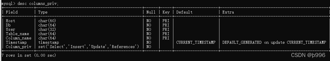 columns_priv表 关于具体某一个字段(某一列)的相关权限。(由五个组成一个联合主键,如上)