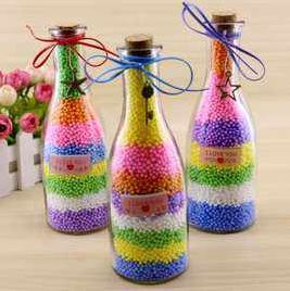 彩虹瓶的制作过程(并不)是这样的:先把一大批空瓶铺放在装填场地上,然后按照一定的顺序将每种颜色的小球均匀撒到这批瓶子里。