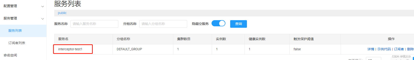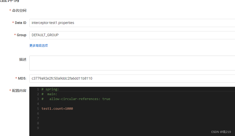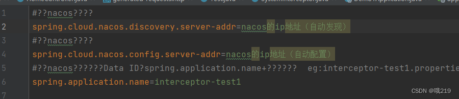 spring.cloud.nacos.discovery.server-addr=nacos的ip地址(自动发现) spring.cloud.nacos.config.server-addr=nacos的ip地址(自动配置) spring.application.name=interceptor-test1