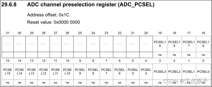 注意:STM32MP157的ADC支持单端/差分转换,由寄存器ADC_DIFSEL控制,我们一般使用单端转换模式,默认这个寄存器都是0的,刚好就是单端转换模式。