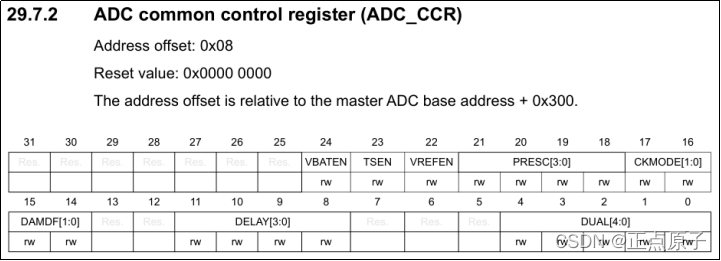 CKMODE[1:0]=00,这是异步时钟模式选择的配置,适用于下面要讲的adc_ker_ck时钟。