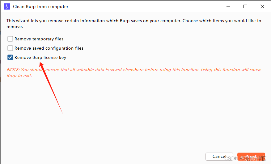 Burp Suite激活后卸载取消注册的方法 然后找到了在Burp Suite的help界面下最后一行有个叫Clean Burp from computer(清除计算机中的Burp)点击后选择箭头指向的移除lincebse key,然后点击next。是因为没有将config.cfg文件删除,所以没有出现注册机页面而是直接出现输出激活码的页面。将其删除后再次打开发现成功打开注册机。然后就可以接着去重新激活配置。然后取消激活后想重新激活的话会直接报出一下页面。然后删除license key删除成功,
