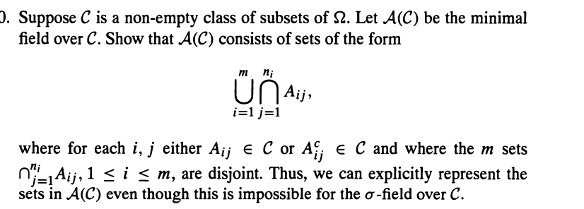 实变函数论——域——题解 Suppose C\mathcal{C}C is a non-empty class of subsets of Ω\OmegaΩ. Let A(C)\mathcal{A}(\mathcal{C})A(C) be the minimal field over C\mathcal{C}C. Show that A(C)\mathcal{A}(\mathcal{C})A(C) consists of sets of the form∪i=1m∩j=1niAij,\cup_{i=1}^{m}\cap_{j=1}
