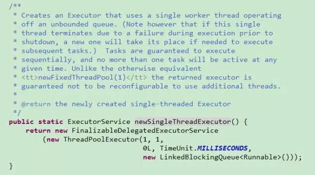 单线程线程池,核心线程数和最大线程数均为1,空闲线程存活0毫秒同样无意思,意味着每次只执行一个线程,多余的先存储到工作队列,一个一个执行,保证了线程的顺序执行。
