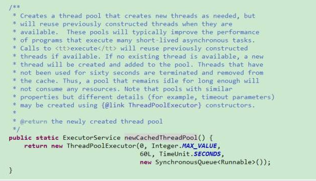 带缓冲线程池,从构造看核心线程数为0,最大线程数为Integer最大值大小,超过0个的空闲线程在60秒后销毁,SynchronousQueue这是一个直接提交的队列,意味着每个新任务都会有线程来执行,如果线程池有可用线程则执行任务,没有的话就创建一个来执行,线程池中的线程数不确定,一般建议执行速度较快较小的线程,不然这个最大线程池边界过大容易造成内存溢出。