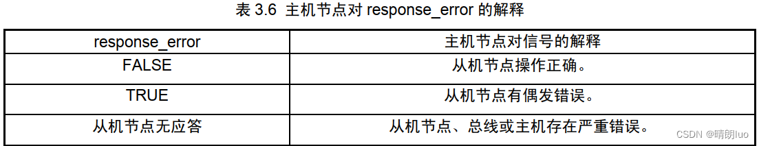 协议强制规定,每个从机节点都要在它发布的某个无条件帧中包含一个长度为一位的标量信号response_error,向主机节点报告自身状态。主机节点负责接收这个信号并且执行分析,如表 3.6 所示。事件触发帧由于允许总线冲突,需特殊处理。