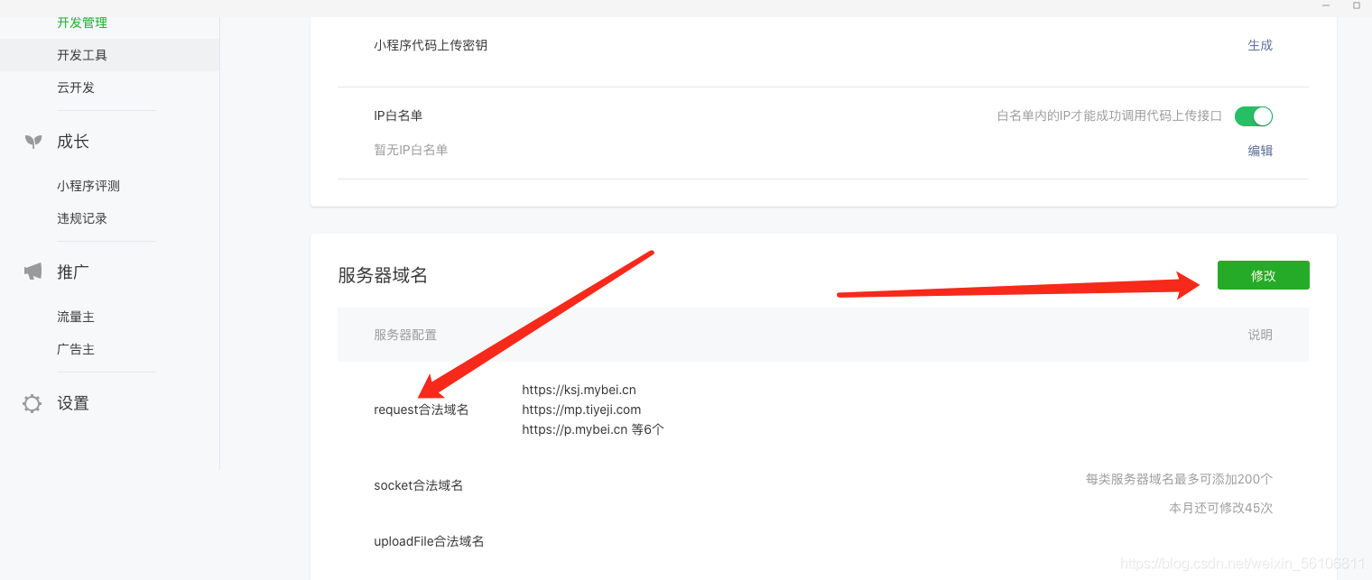 2.微信小程序->开发管理->开发设置 添加 request的域名: 地址:
