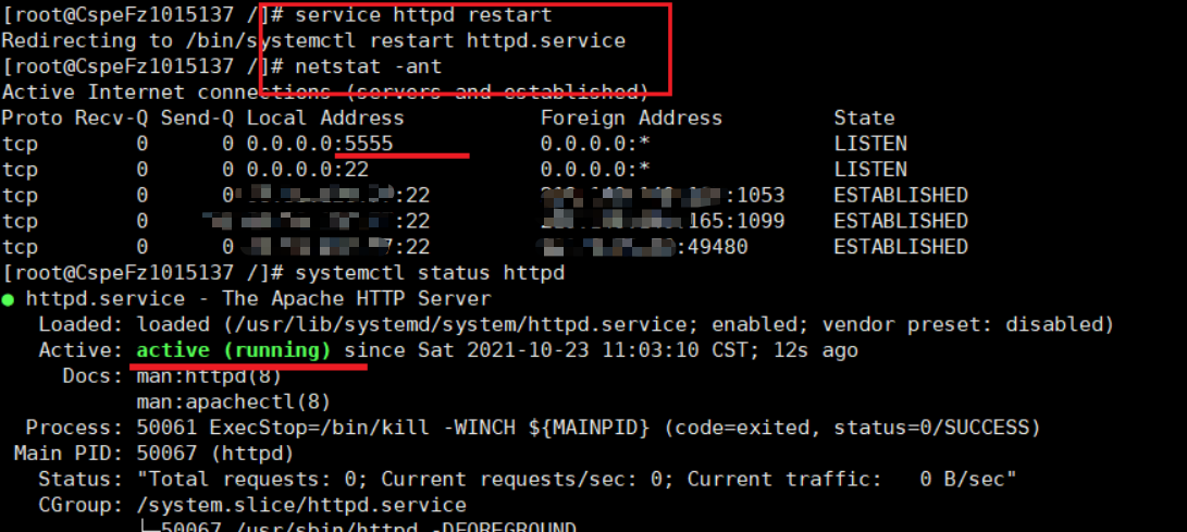 重启一下apache服务,手动查看一下端口情况,5555正常监听就没问题