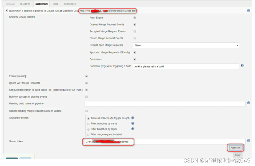 配置自动触发,点击构建触发器,先勾选Build when a change is pushed to GitLab,点击高级,然后再点击一下Generate就会生成一个Secret Token,如下