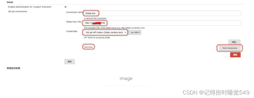 Credentials选择刚创建的GitLab Api Token,然后点下Test Connection,看下是否成功,如成功点击最下面的保存