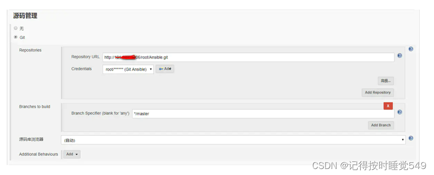 源码管理选择git,选择Add-Jenkins,配置Gitlab的账号密码