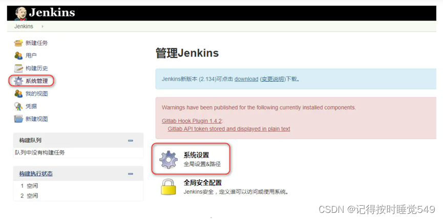 配置jenkins连接gitlab,选择左侧的系统管理,然后选择中间的系统设置