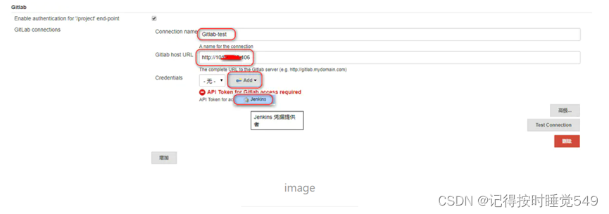配置GitLab,Connection Name随便填,Git Host URL填GitLab的访问地址,然后点Add—jenkins,如图: