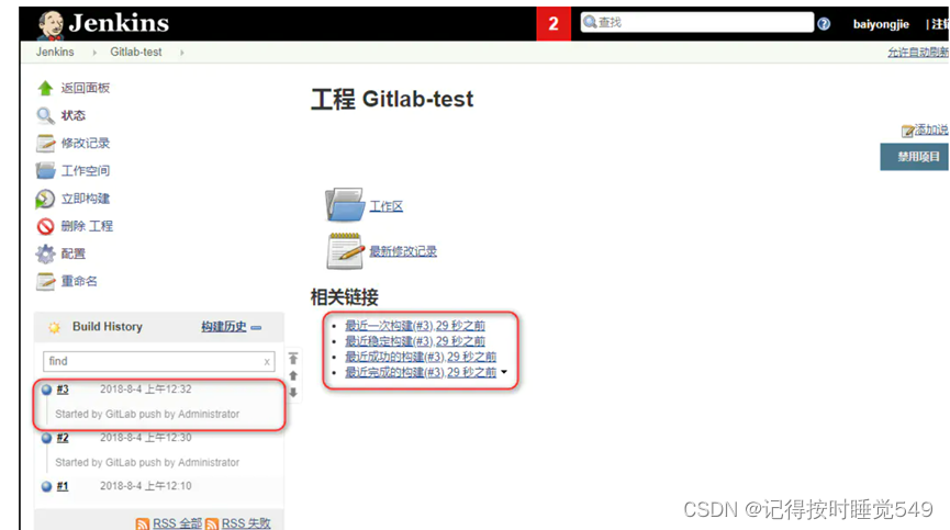 到Jenkins查看构建记录,发现push动作已经出发了Jenkins的自动构建
