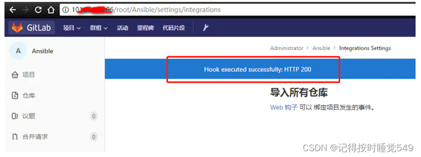在gitlab进入那个叫Ansible的项目,点击设置,点击导入所有仓库,在URL里填写刚刚记下来的URL,在安全令牌里填写刚刚记下来的Secret Token,如图: