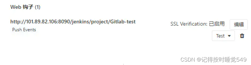 对刚刚生成的web钩子点击test,选择push events,然后就会出现200的成功字样,如图: