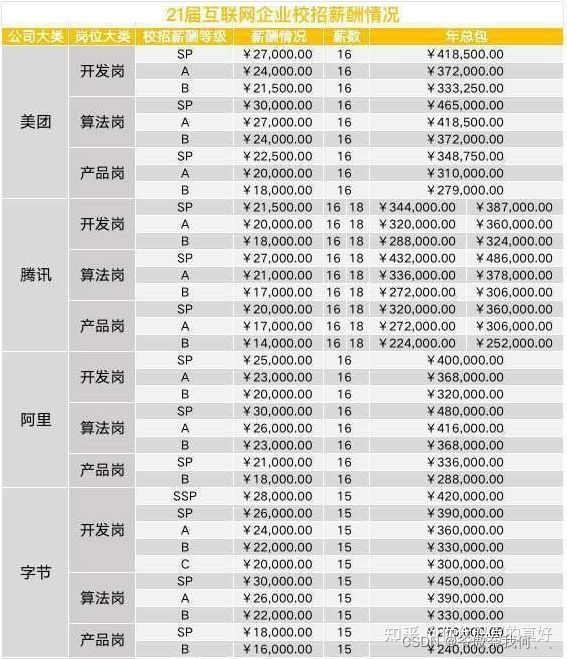 这里也贴一下去年21 届各个大厂的开发岗、产品岗、算法岗的薪资,今年的校招生开奖了可以比对一下涨幅: