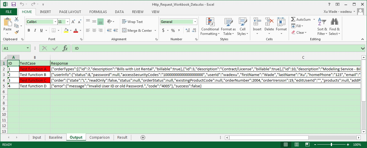 思想是数据驱动测试,用Excel来管理数据,‘Input’ Sheet中存放输入数据,读取数据后拼成request 调用service, 拿到response后写入 ‘Output’ Sheet 即实际结果, ‘Baseline’为基线(期望结果)用来和实际结果对比的,‘Comparison’ Sheet里存放的是对比结果不一致的记录,‘Result’ Sheet 是一个简单的结果报告。