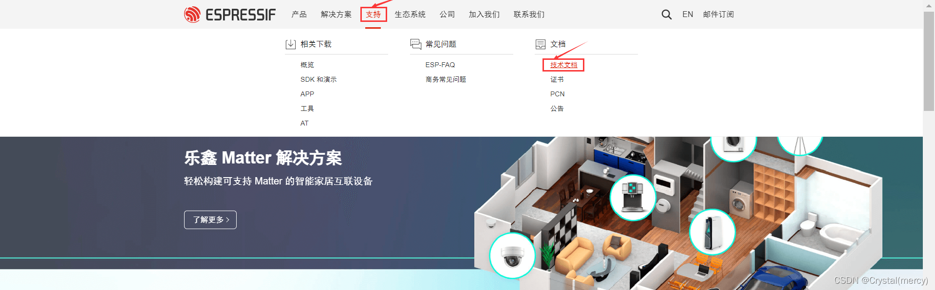 授人以鱼不如授人以渔,学会找学习资料很重要。在乐鑫的官网上,给出了各种型号的技术支持,点击支持,技术文档。