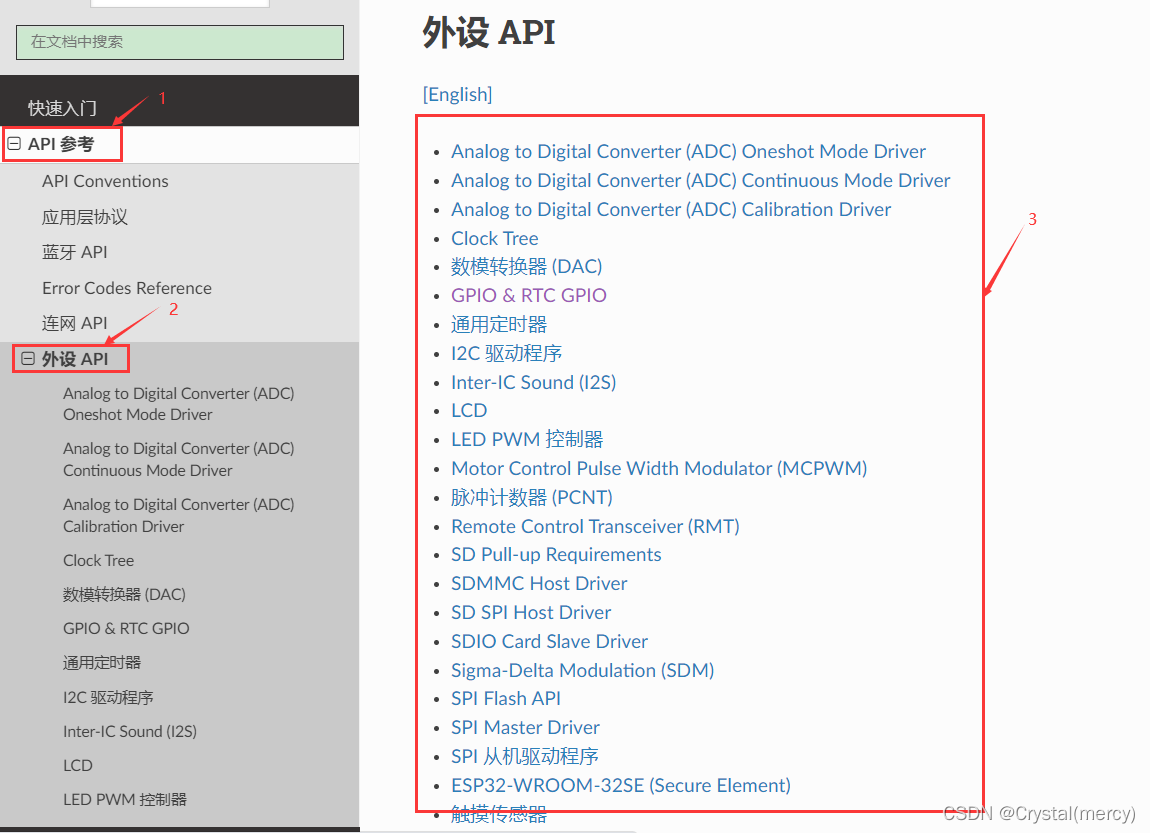 点击开来后,里面有非常详细的教程。这里我们重点关注它的各个API接口,点击API参考,外设API,里面列出了关于各类外设对于的API。这边文章主要介绍关于GPIO配置的各种API函数,后面各种接口函数将在后面学习过程中依次介绍。这里我们选泽GPIO & RTC GPIO。