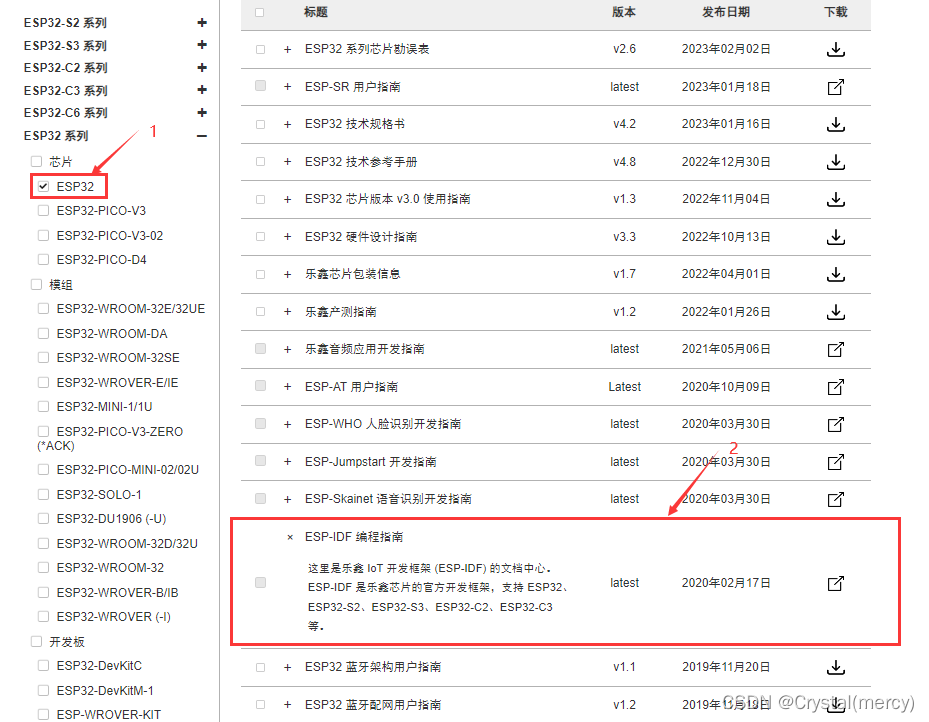 我所使用的开发板为ESP32,所以选择ESP32,选择ESP-IDF编程指南。