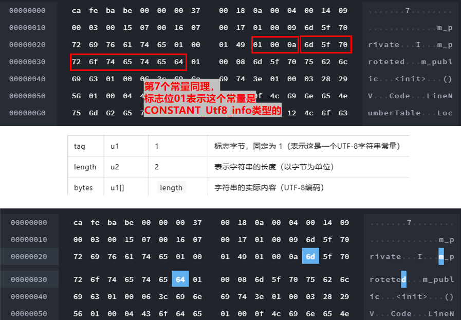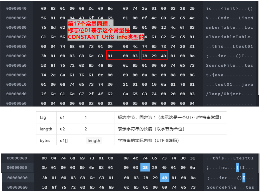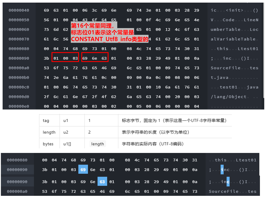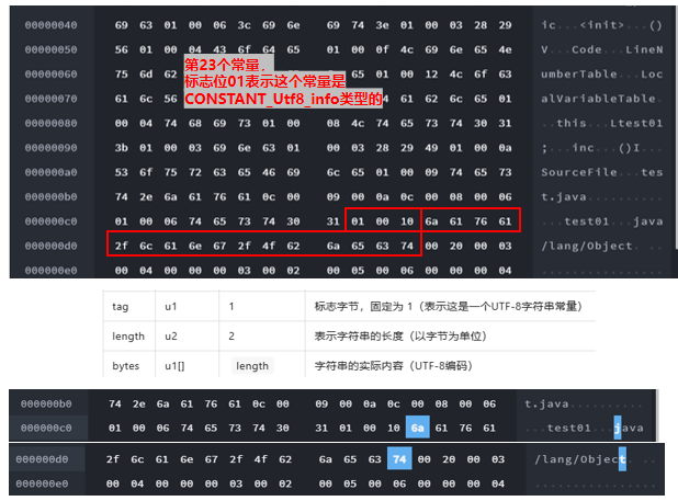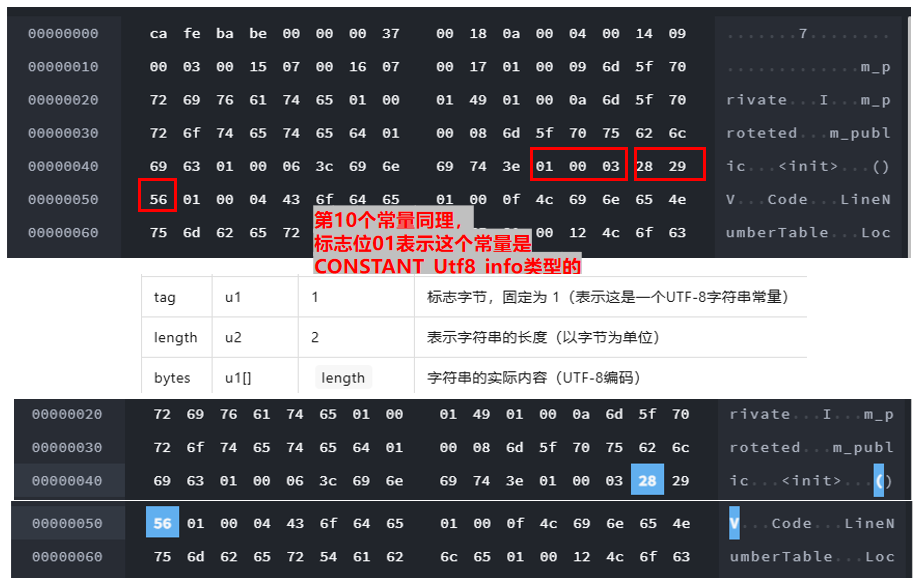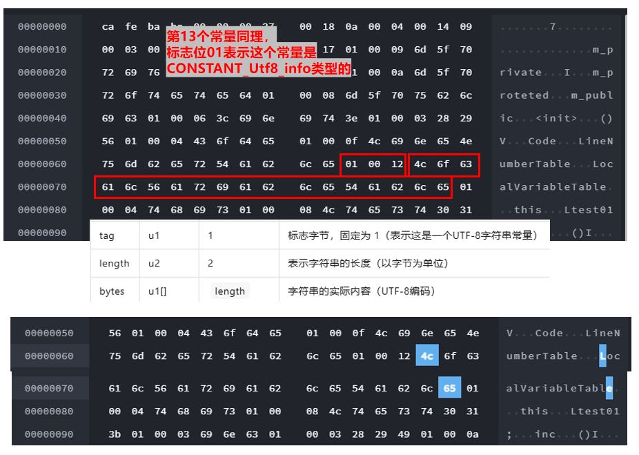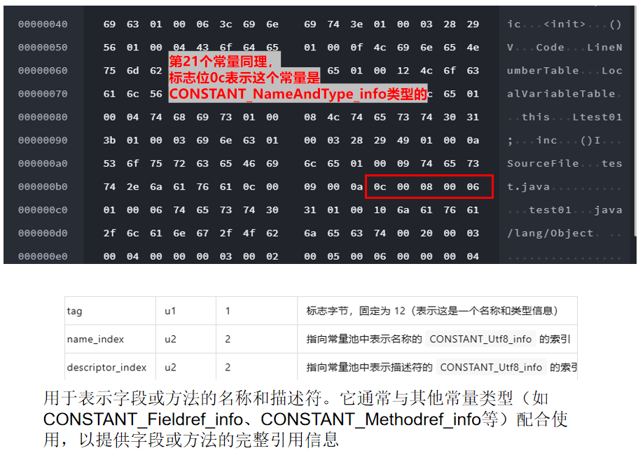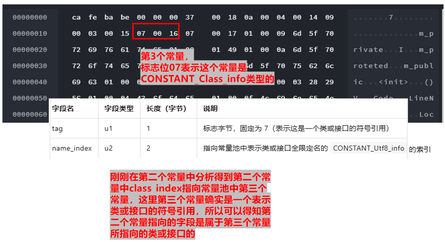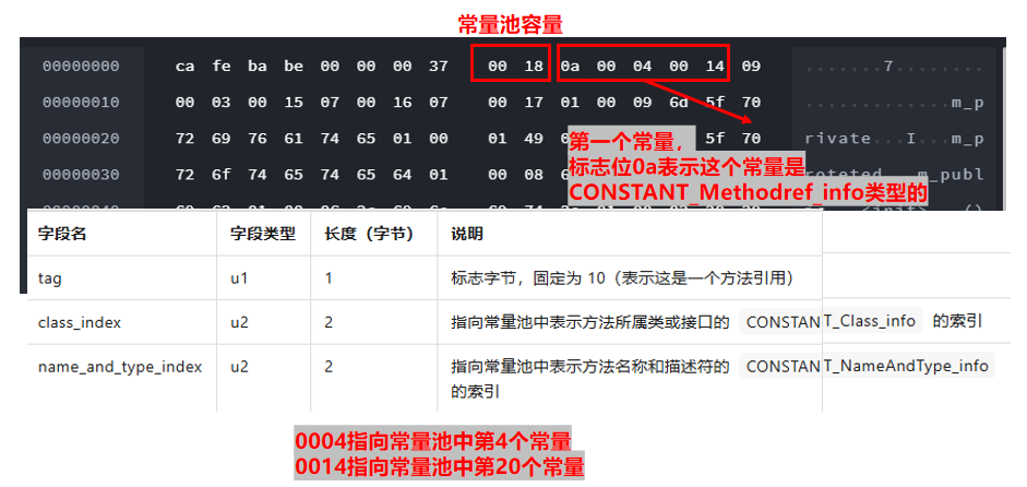 由于常量池中常量的数量是不固定的,所以在入口放置一个u2类型的数据代表常量池的容量计数值,比如我上面的实例代码中的0018就代表常量池中的常量数量,转换成10进制就是24,就代表常量池中有23个常量,索引值范围为1-23(第0个索引对应的常量通常是空出来有特殊考虑的,用来表示不引用任何一个常量的话,通常就指向0)