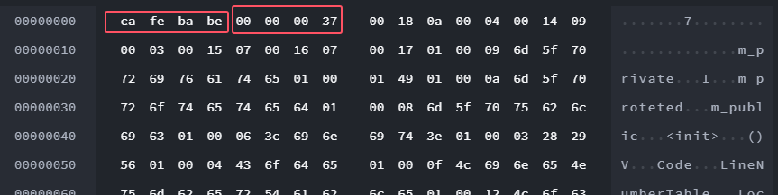 我写了一个样例代码,把生成的class文件用16进制编辑器打开可以看到前4个字节cafebabe是魔数,后面四个字节分别是版本号,次版本号是00,主版本号是37,37转换成10进制是53,说明可以被JDK9及以上的版本解析