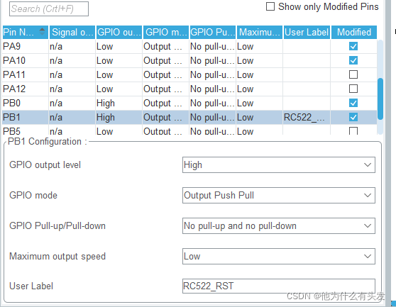 这里配置只会配置SPI的三个引脚,没有配置SPI的片选引脚,以及RC522卡上还有RST复位引脚也需要我们自己配置,任意选择一个GPIO引脚都可以配置为片选引脚,RTS引脚也是可以任意GPIO引脚,当然我们为了方便就直接用SPI2的片选引脚,也就是PB12,RTS引脚就随便一个IO引脚,我这里用PB1,配置如下: