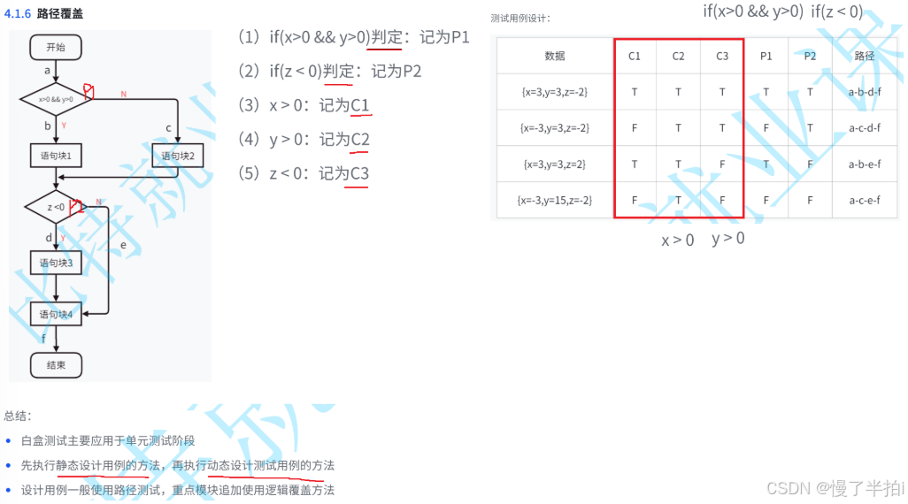 • 测试内容:模块接⼝测试、局部数据结构测试、路径测试、错误处理测试、边界测试